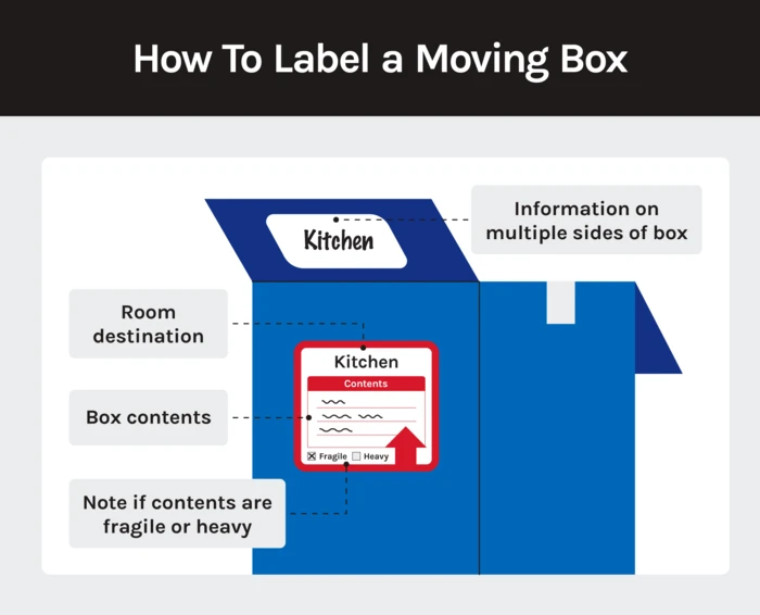 You should label each box on multiple sides with its destination in your new home, contents and if anything’s fragile. This will ensure movers bring the right boxes to the correct rooms and will make your unpacking process easier.