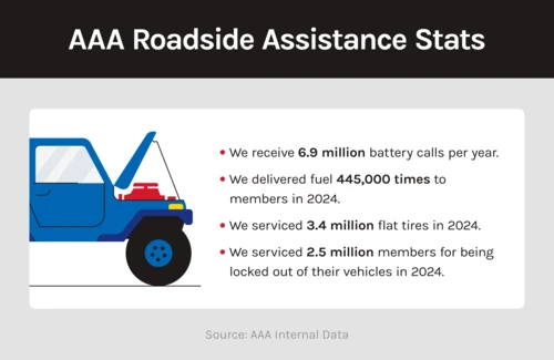 Roadside assistance is one of the original AAA services and has evolved to cover modern motorists’ needs. AAA responds to over 27 million roadside assistance requests per year, with an average of 52 members helped per minute.